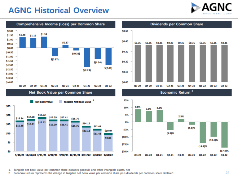 AGNC reported its Q3 2022 results on October 25th, 2022. Tangible book value per share was down from $11.43 in the June quarter to $9.08 at the end of September. Economic return of tangible common equity was -17.4%, versus -10.1% in the second quarter.